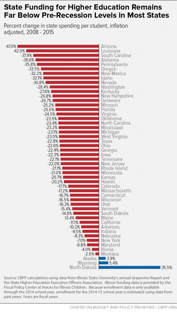 As much of the country expands funding for community colleges, and with that funding, improved course offerings and increased access to higher education, Arizona has taken the unusual step of taking funding away from some of its community college systems. In fact, according to data just released by the Center on Budget and Policy Priorities, Arizona continues its legacy in 2015 as it did in 2014: leading America in slashes to funding – and in tuition increases.diminish the overall quality of education