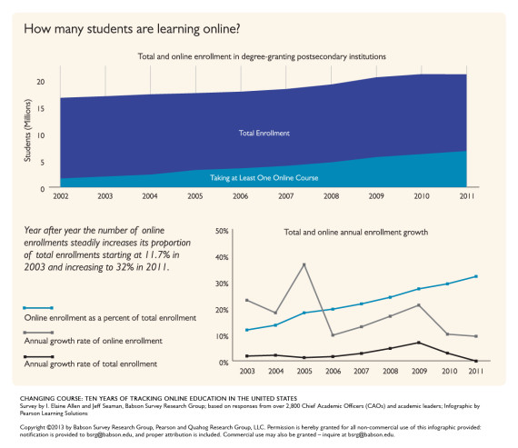 Critics of the OEI worry that the problems of online courses, which are evident at schools across California and the nation, would only be exacerbated if students are yet another step removed from their professors. However, there is extremely high demand for virtual courses at the community college level. The number of students in the United States enrolled in online courses grew from just 700,000 in 1998 to well over 7 million in 2013. In California, the percentage of community college students taking an online class grew from 12.5 percent in 2006 to 27 percent in 2012. What’s more, as of 2012, half of California’s community colleges offered at least one degree or certificate program that could be obtained completely online. Thus, despite the criticisms by some of online learning, the potential for growth in that sector is just too good to pass up.